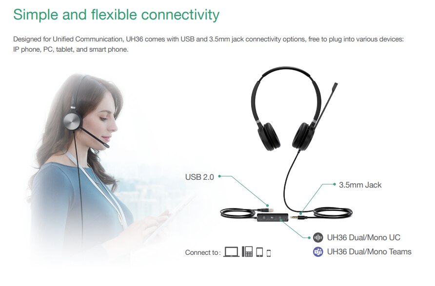 These days, the majority of USB headsets provide several connectivity choices. The Yealink UH36 headset has a 3.5 mm jack and a USB port. There are two ways to get in touch: